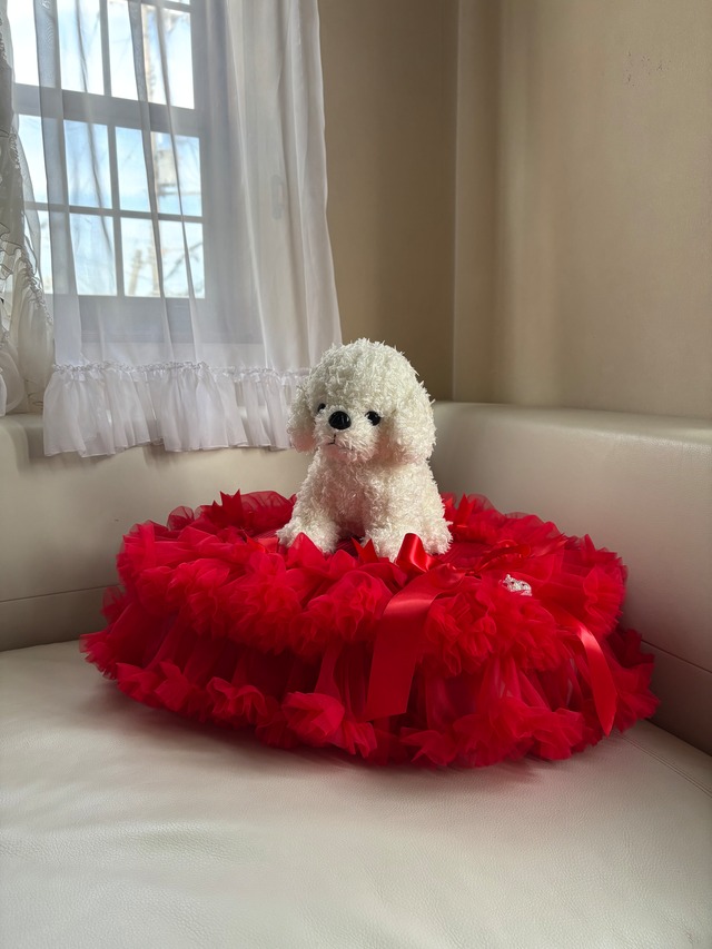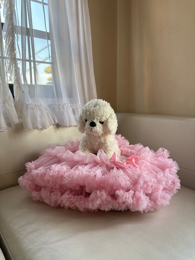 購入時、備考欄に「ご希望のイニシャル」または「王冠」のどちらかをご記入ください。 ご記入がない場合は、王冠にてお届けいたします。 ふんわりと重ねたソフトチュールが、まるでドレスのように広がるプリンセスデザインのカフェマットです。 淡いピンクのチュールに、サテンリボンとイニシャルチャームを添え、可愛さの中にも上品さをプラスしました。 愛犬・愛猫をそっと包み込むような柔らかな仕上がりで、カフェやお出かけ、撮影シーンにもぴったり。 置くだけで空間が華やぎ、特別なひとときを演出します。 イニシャル入りで、世界にひとつだけの特別な一枚に。 大切な家族へのご褒美や、ギフトにもおすすめです。 サイズ 全体(フリル含む) 約縦62㎝横75㎝ お座り部分 約縦21㎝横35cm