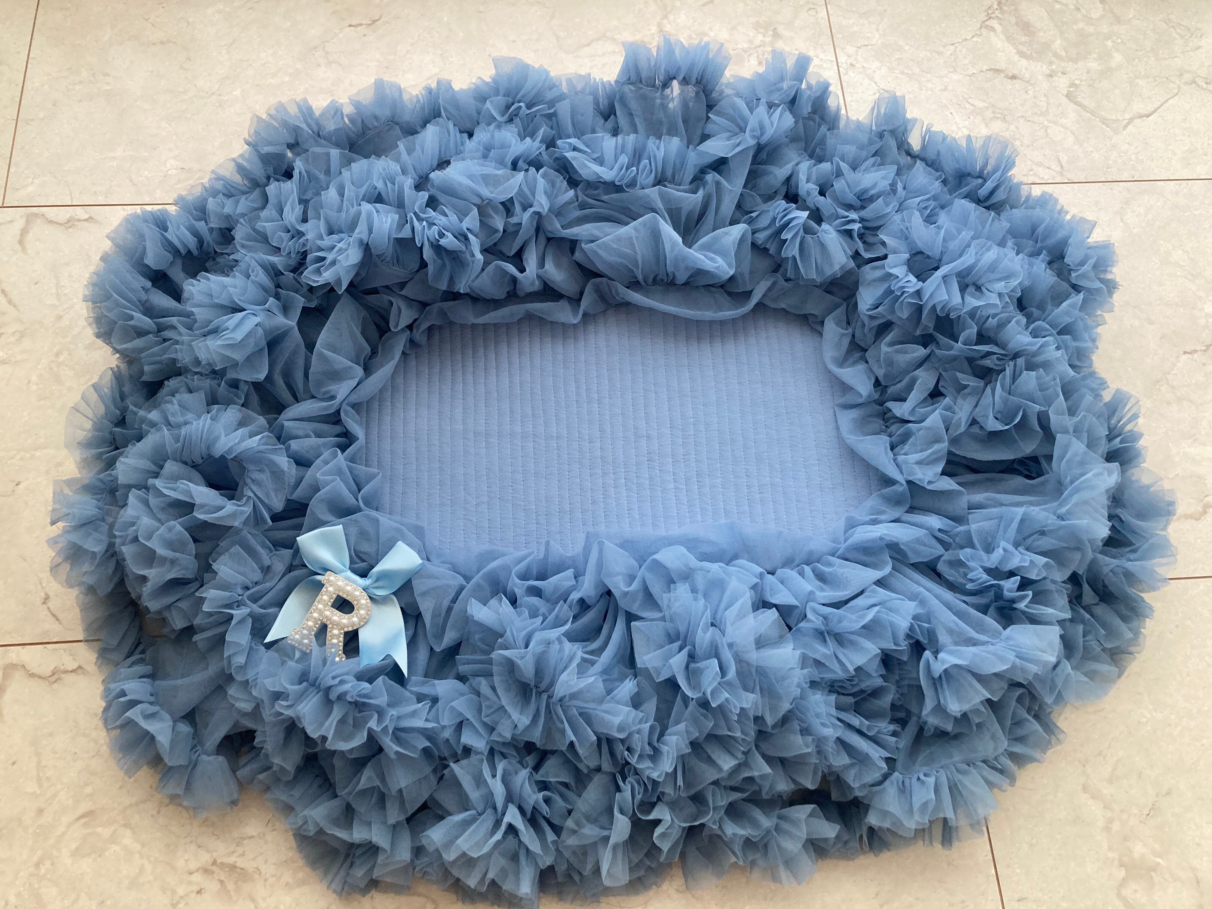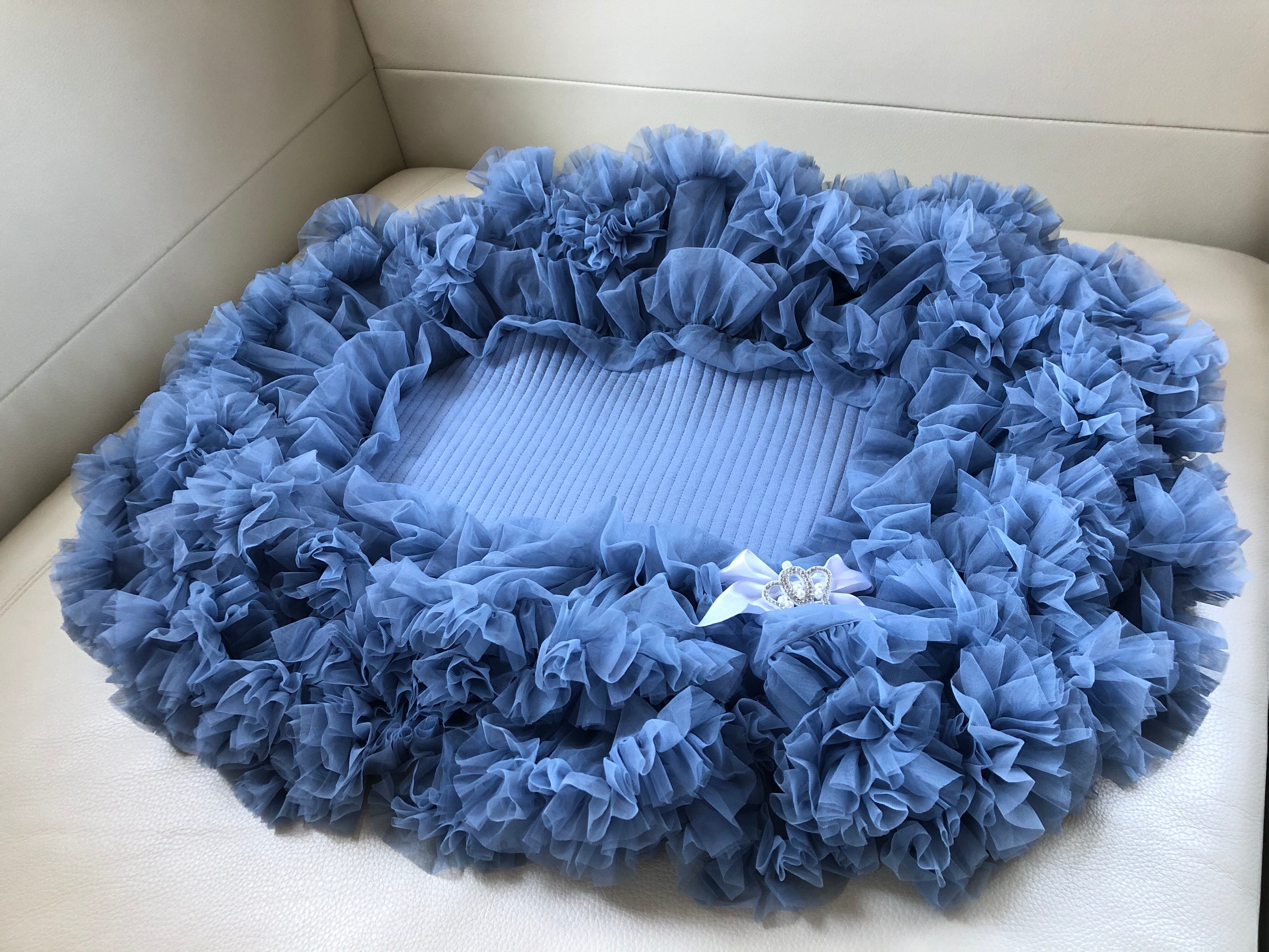 スカイブルーのカフェマット 心安らぐふわふわ感と愛らしいふりるデザインが特徴の「スカイブルーカフェマット」。