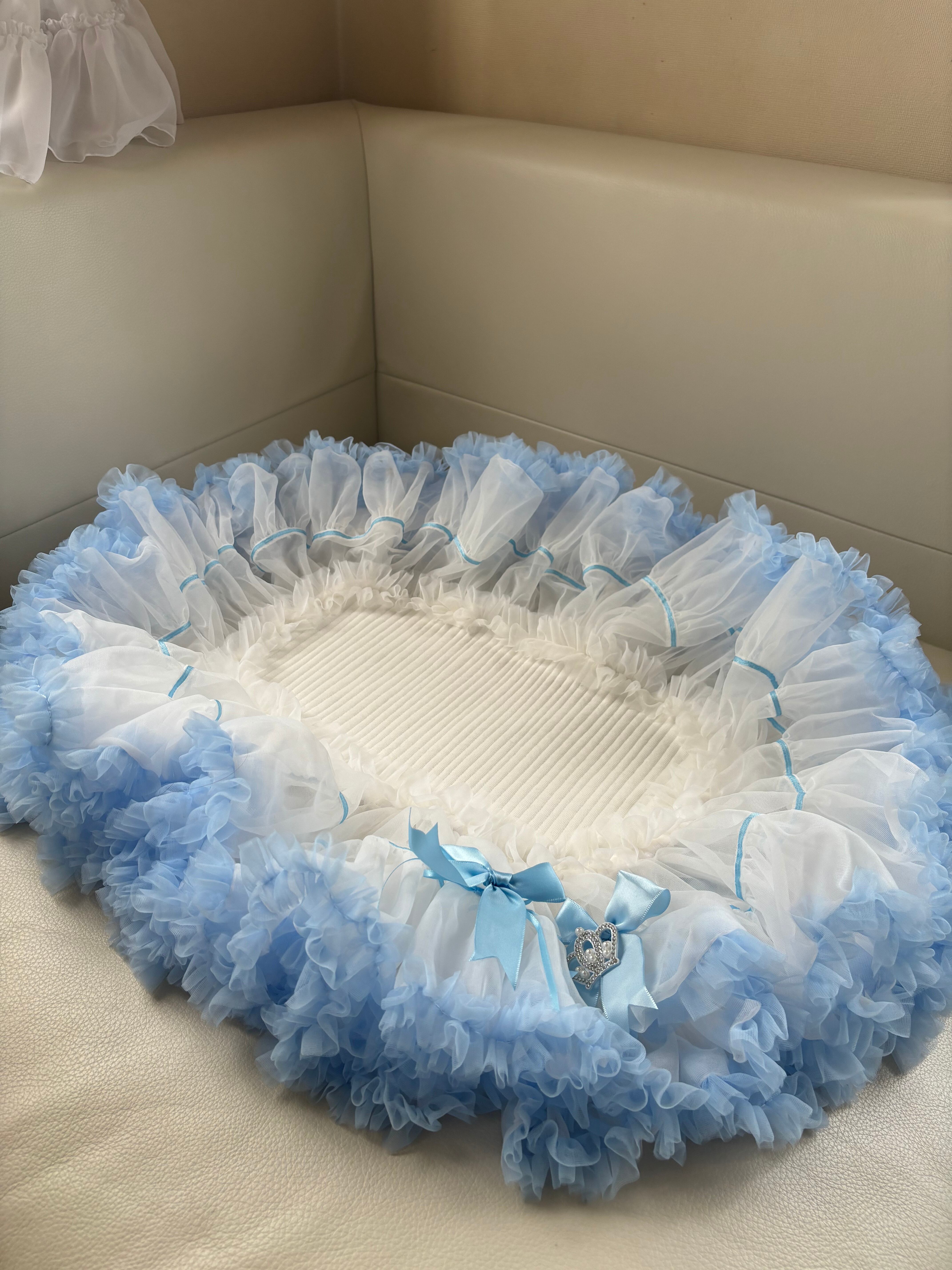 ベイビーブルーの可愛いリボンとふわふわフリルが特徴の「BabyBlueカフェマット」。