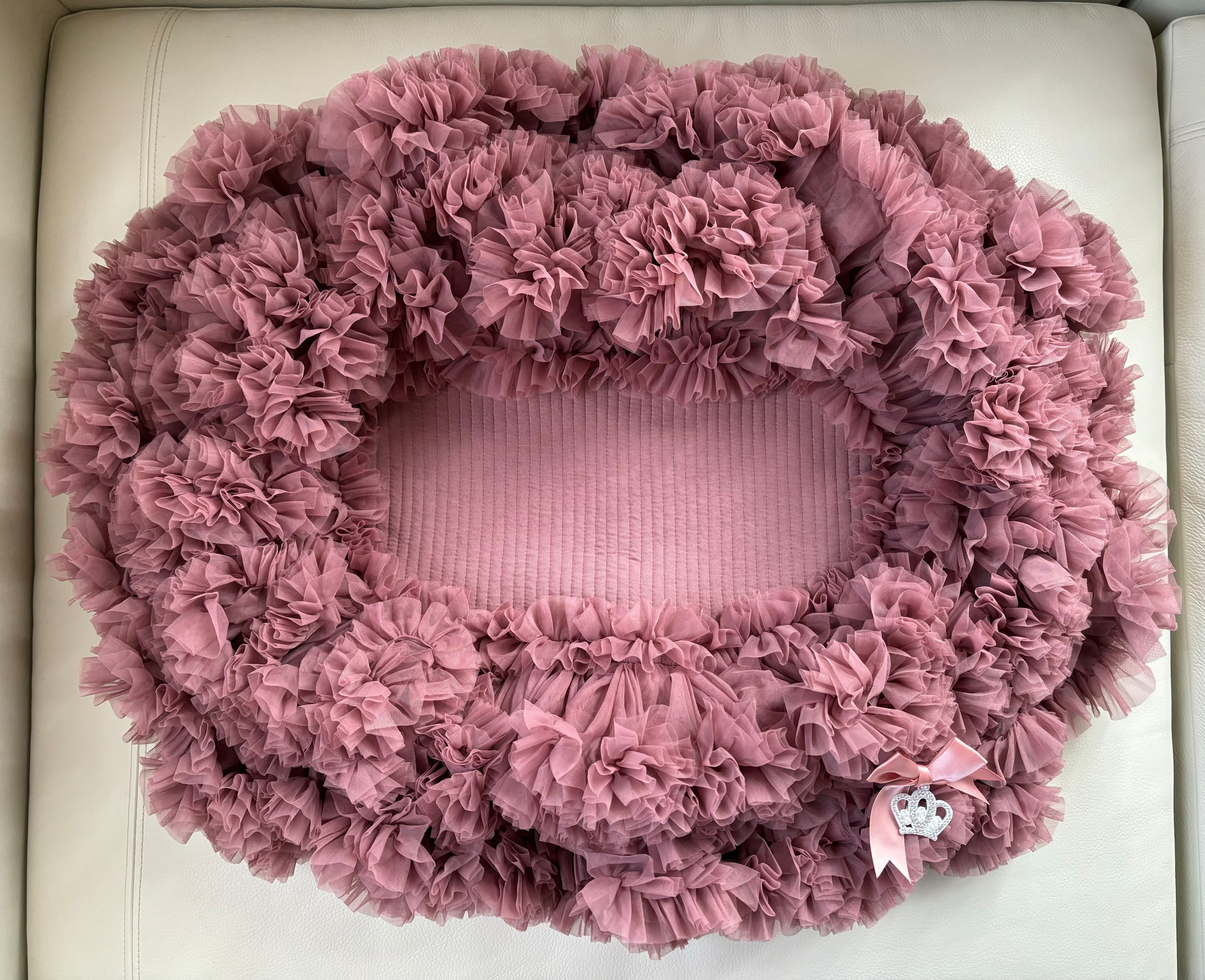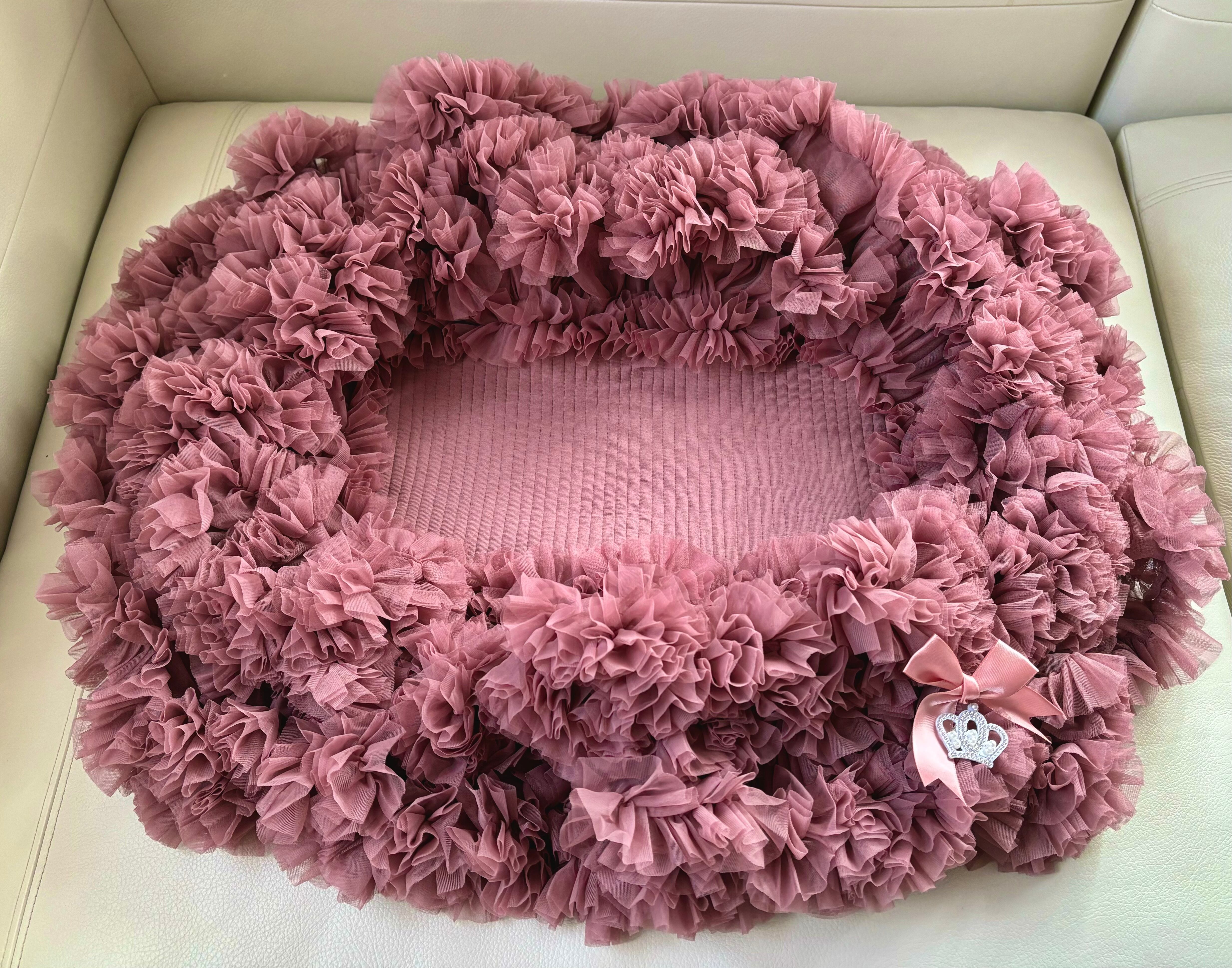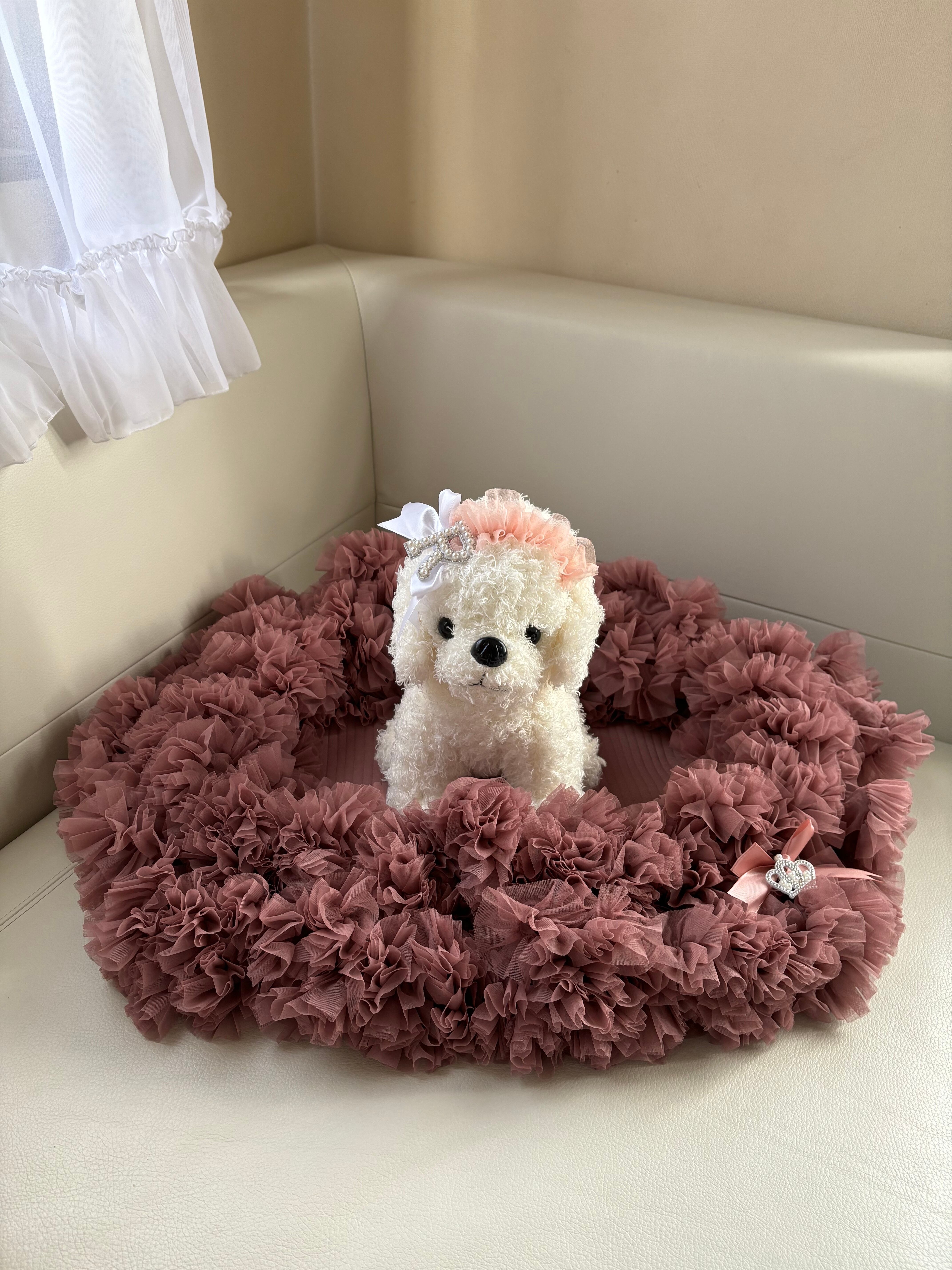 さらにボリュームアップしたデザインと優雅なダスティピンクカラーが特徴の「ダスティピンク」フリフリカフェマット。愛犬の魅力を引き立てる華やかさが、心を和ませてくれます。