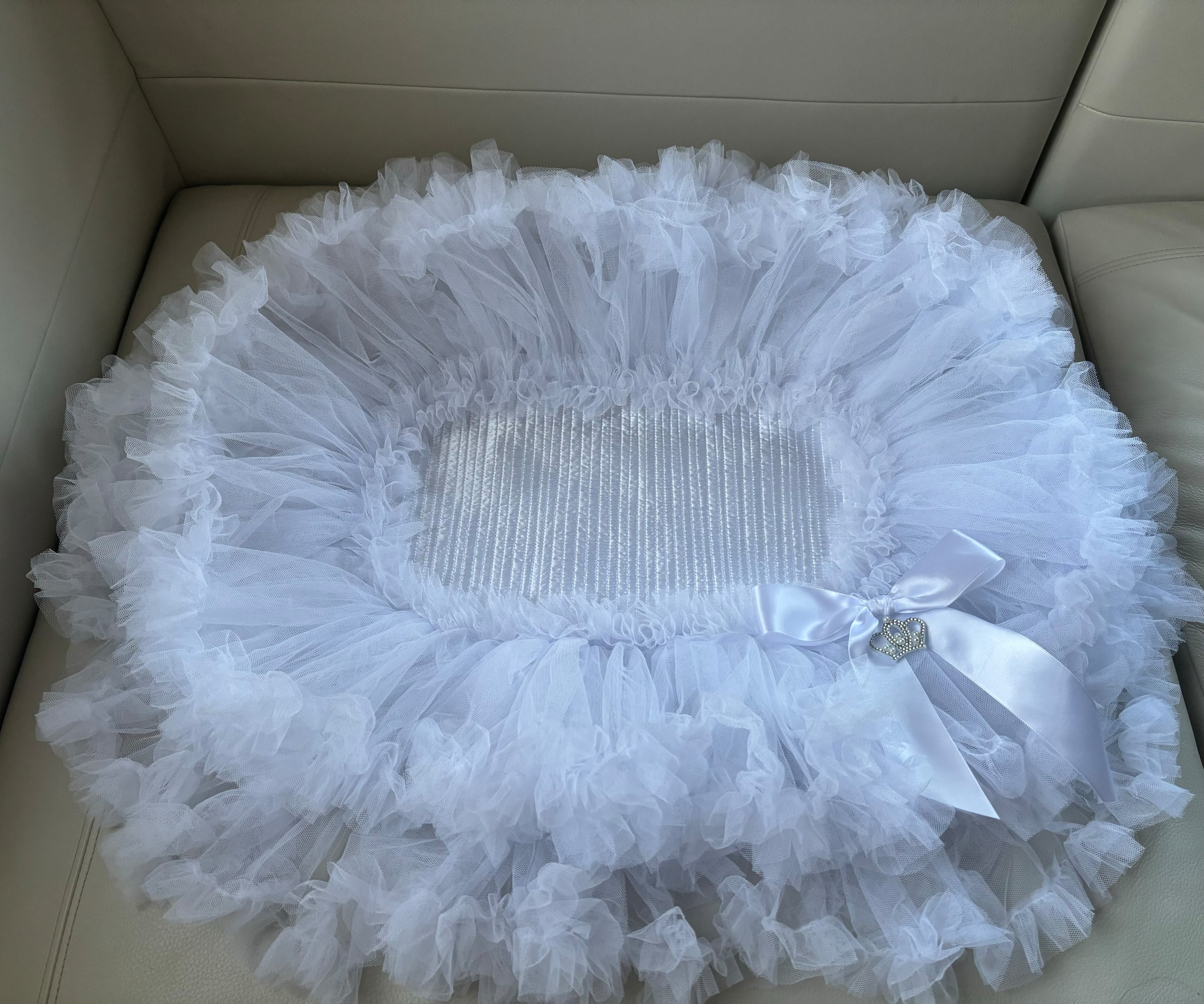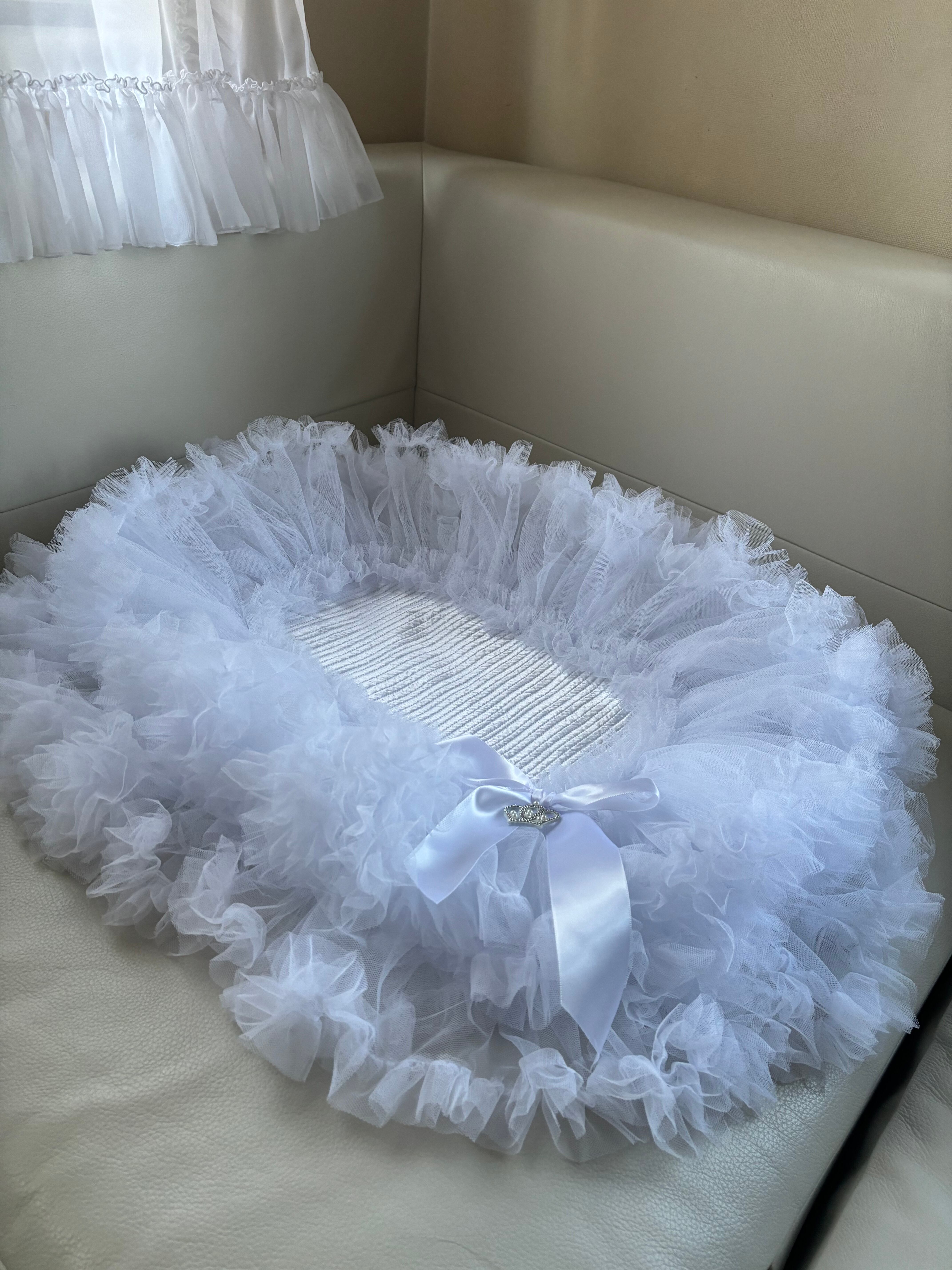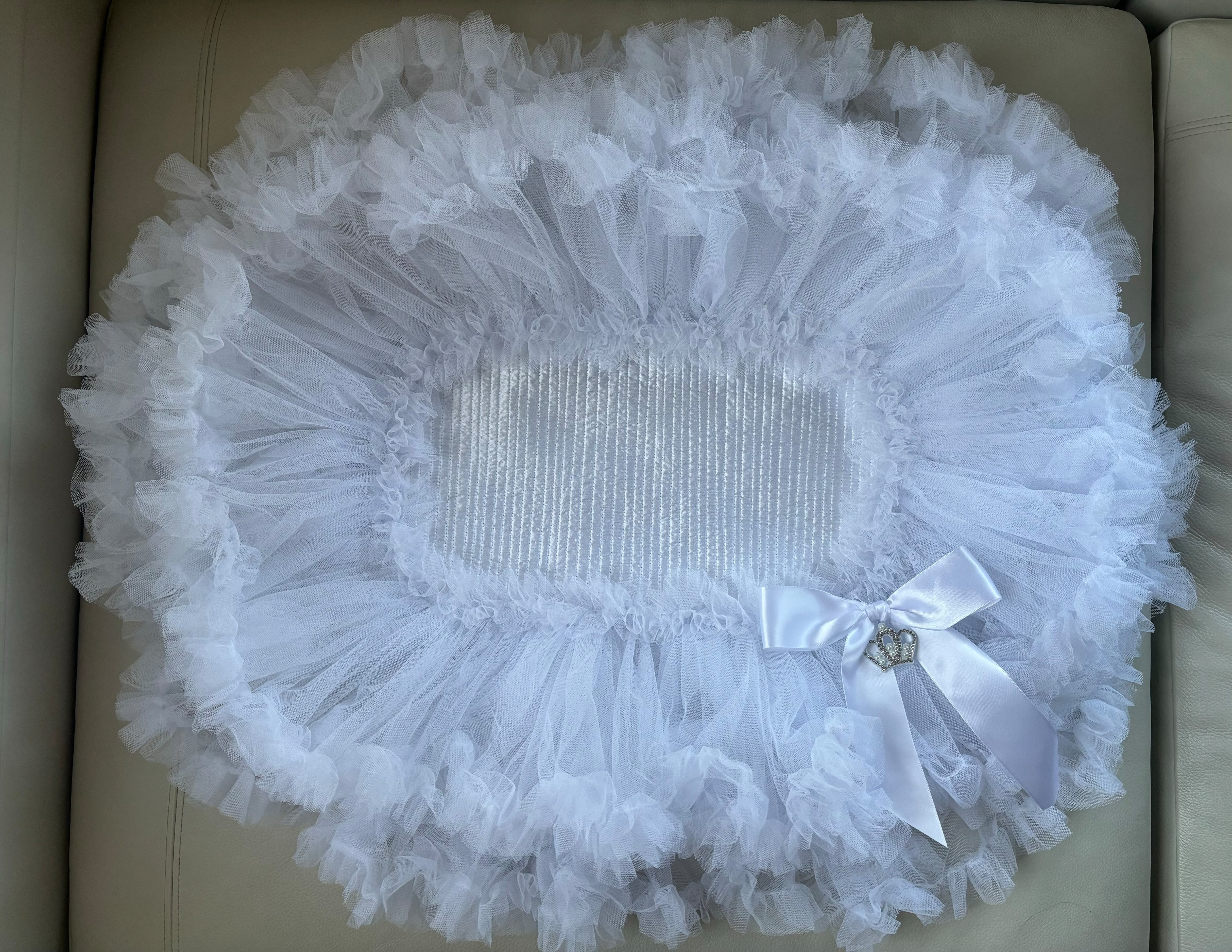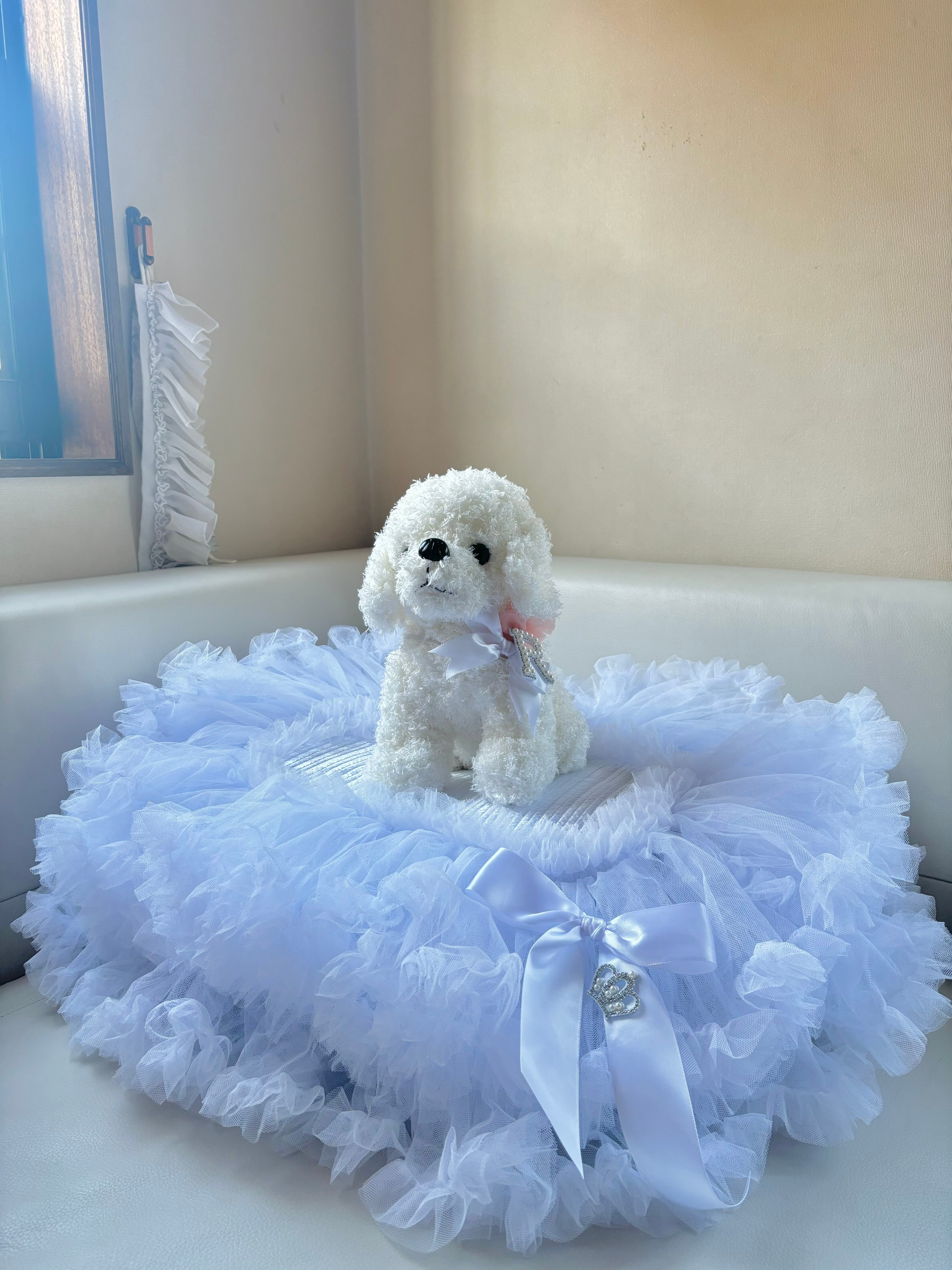 愛犬との特別な瞬間を、よりラグジュアリーに演出! 光沢のあるサテン生地とふわふわフリルで仕上げられた「ラグジュアリアス」カフェマットは、セレブリティなひとときをお約束するアイテムです。