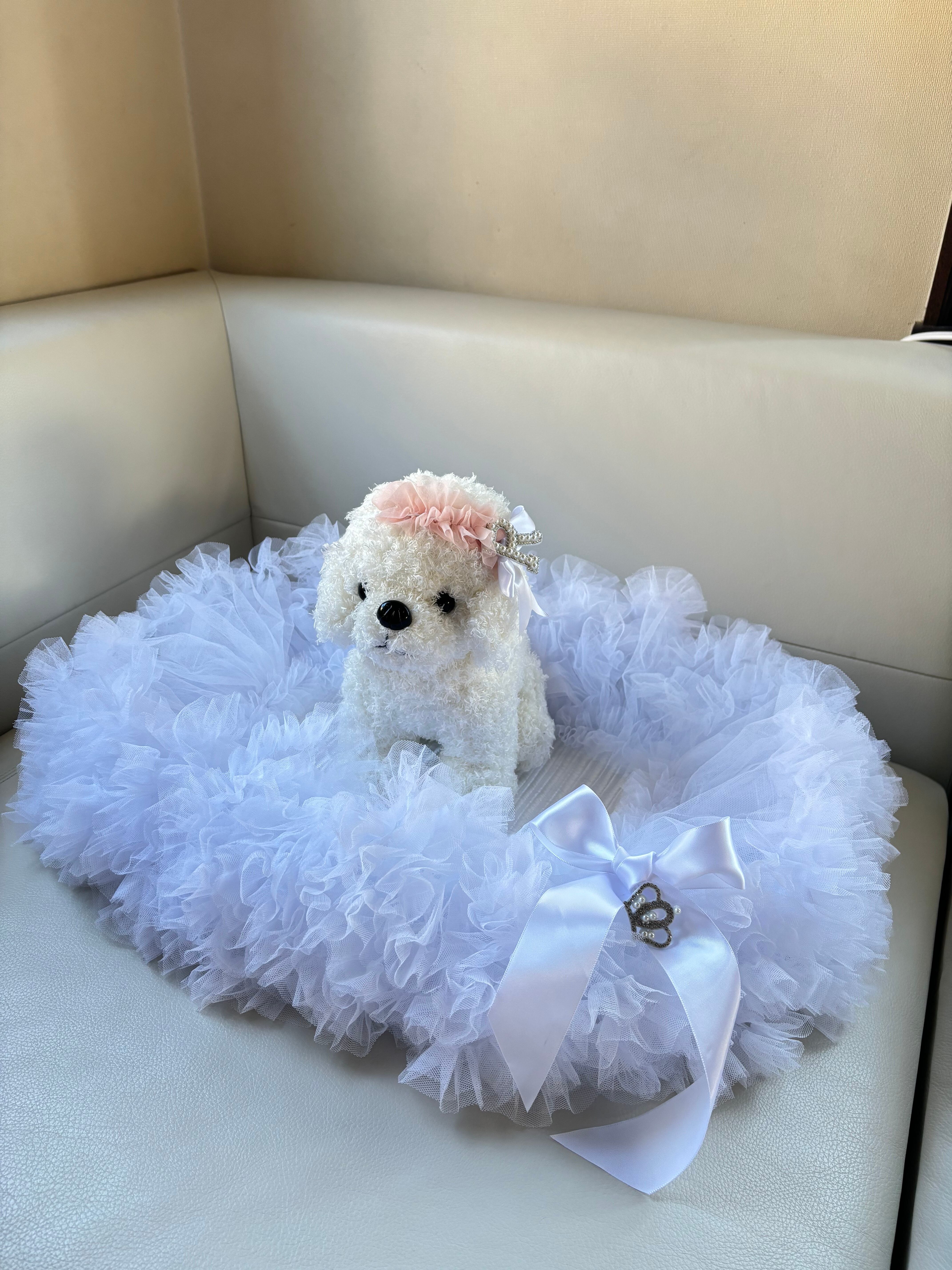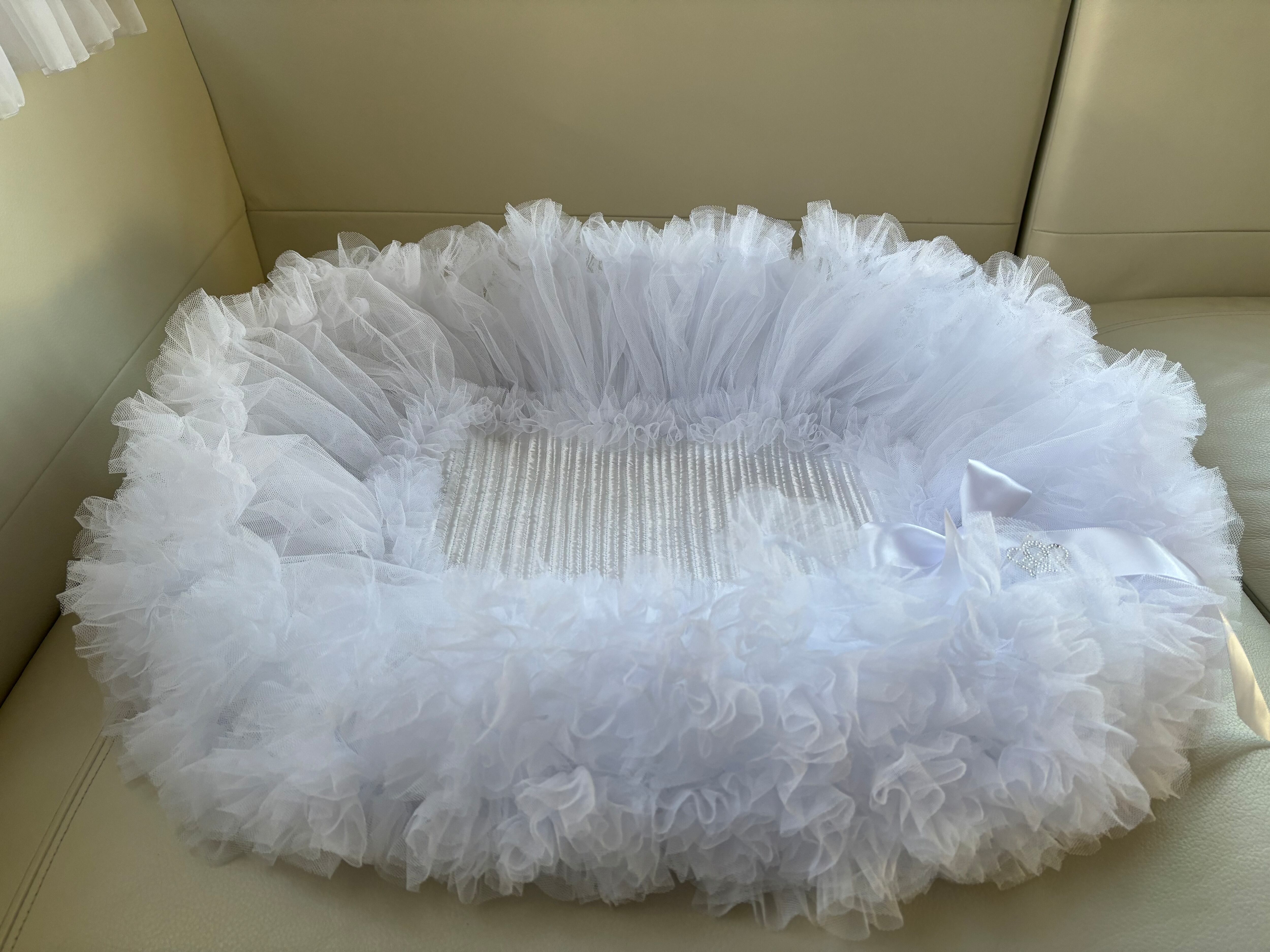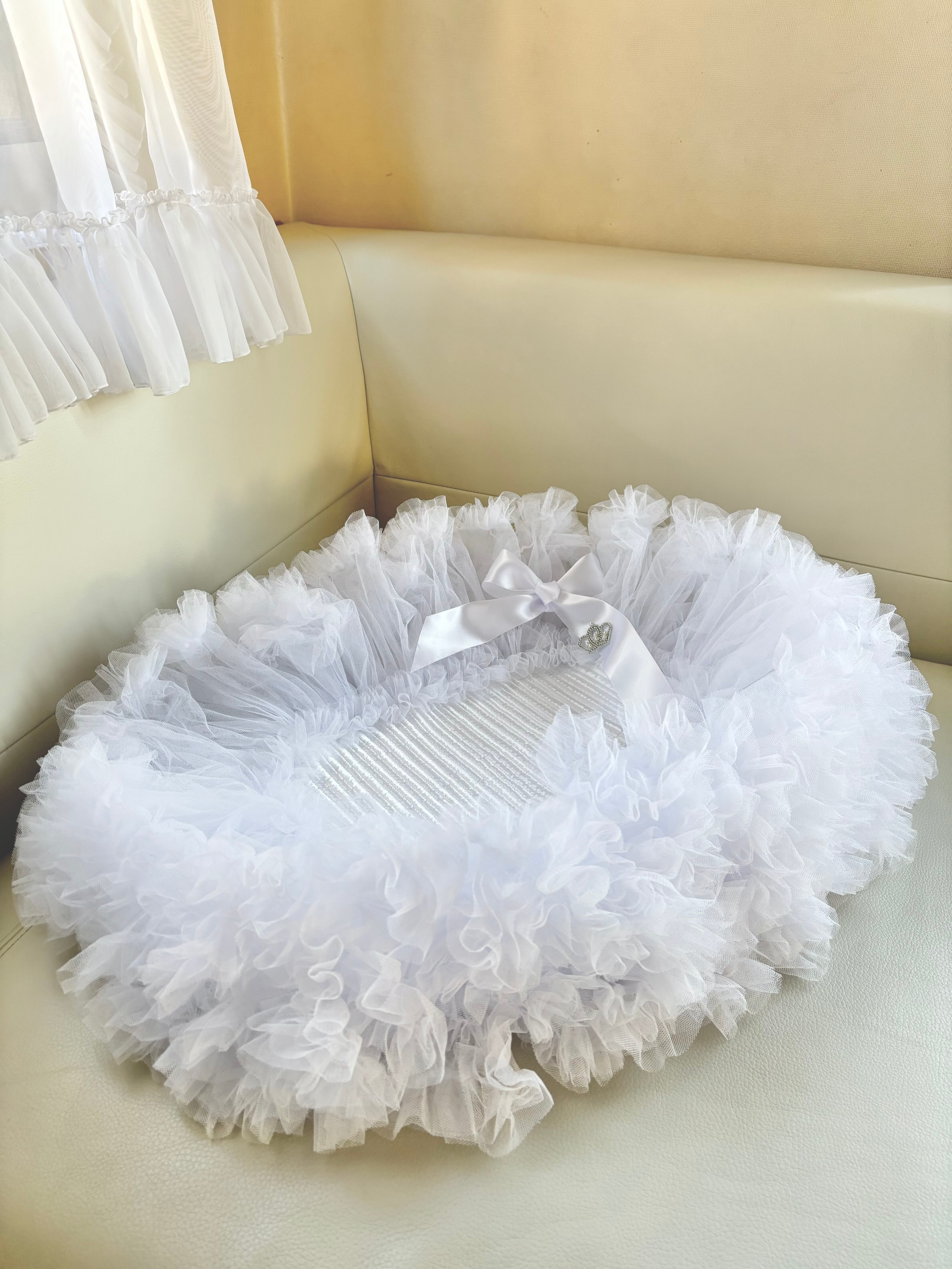 お座り部分には、柔らかなサテン生地を使用し、心地よい時間を提供します。ふわふわのフリルが愛犬を優しく包み込み、特別なひとときを演出するラグジュアリーなマットです。