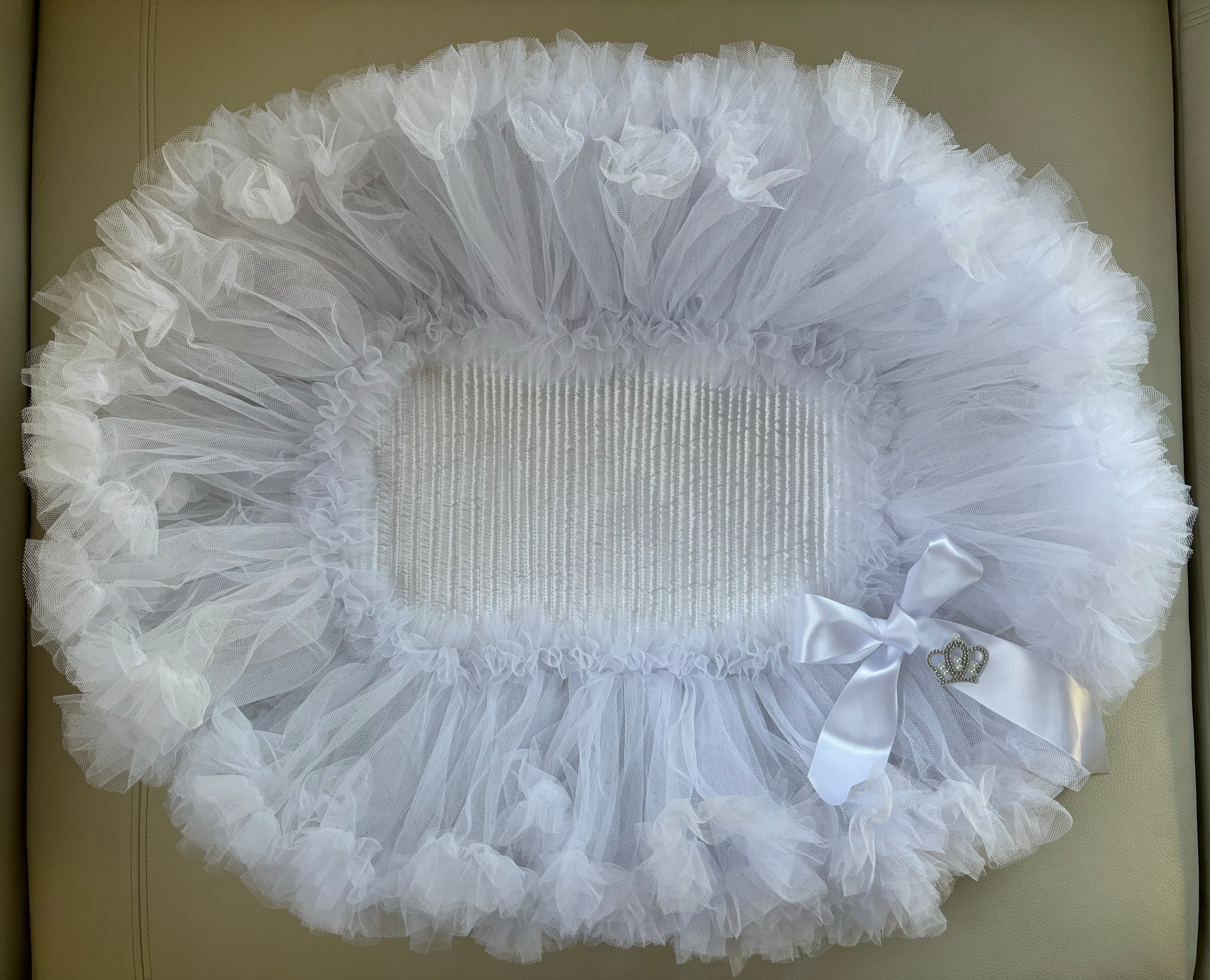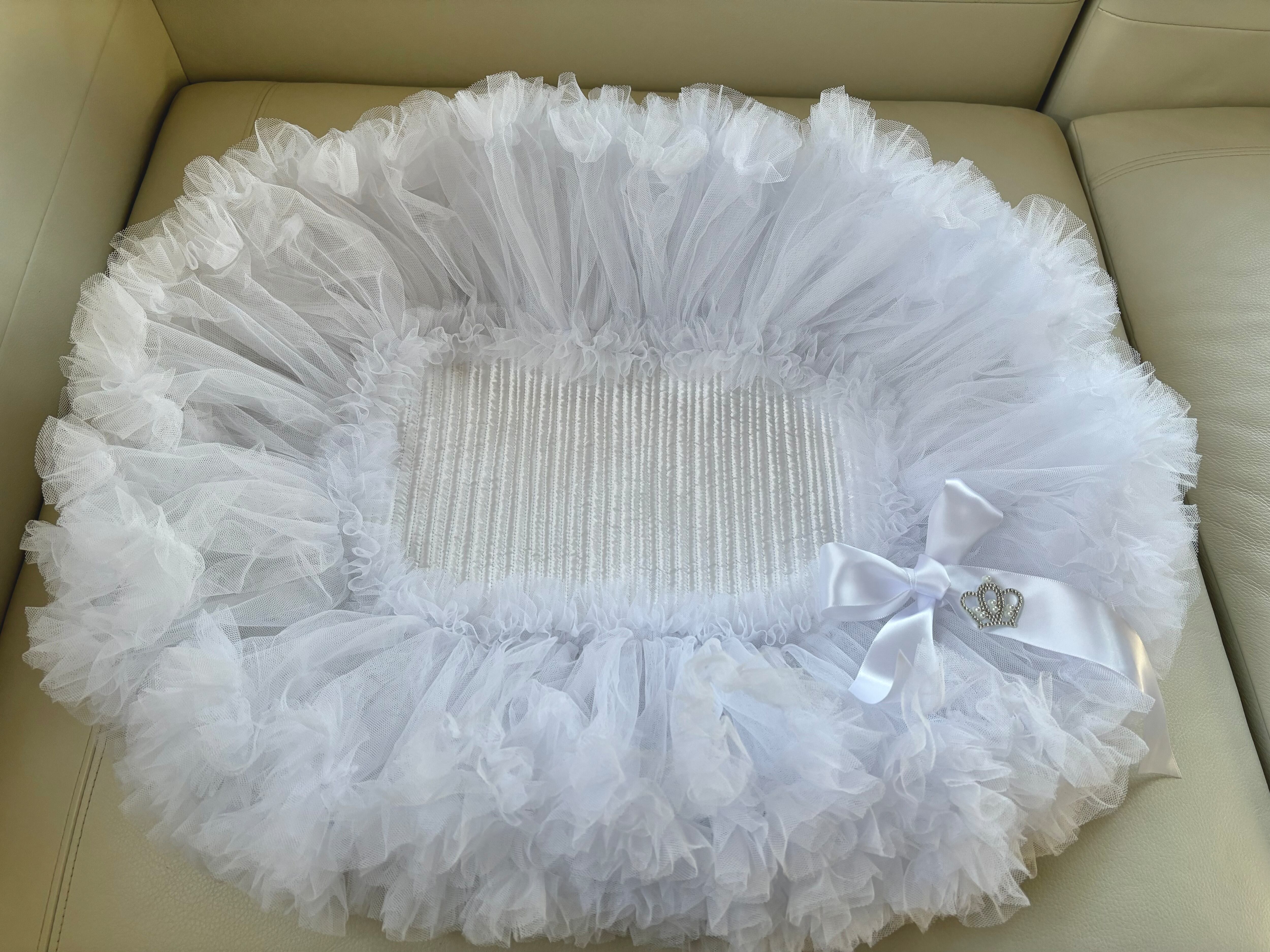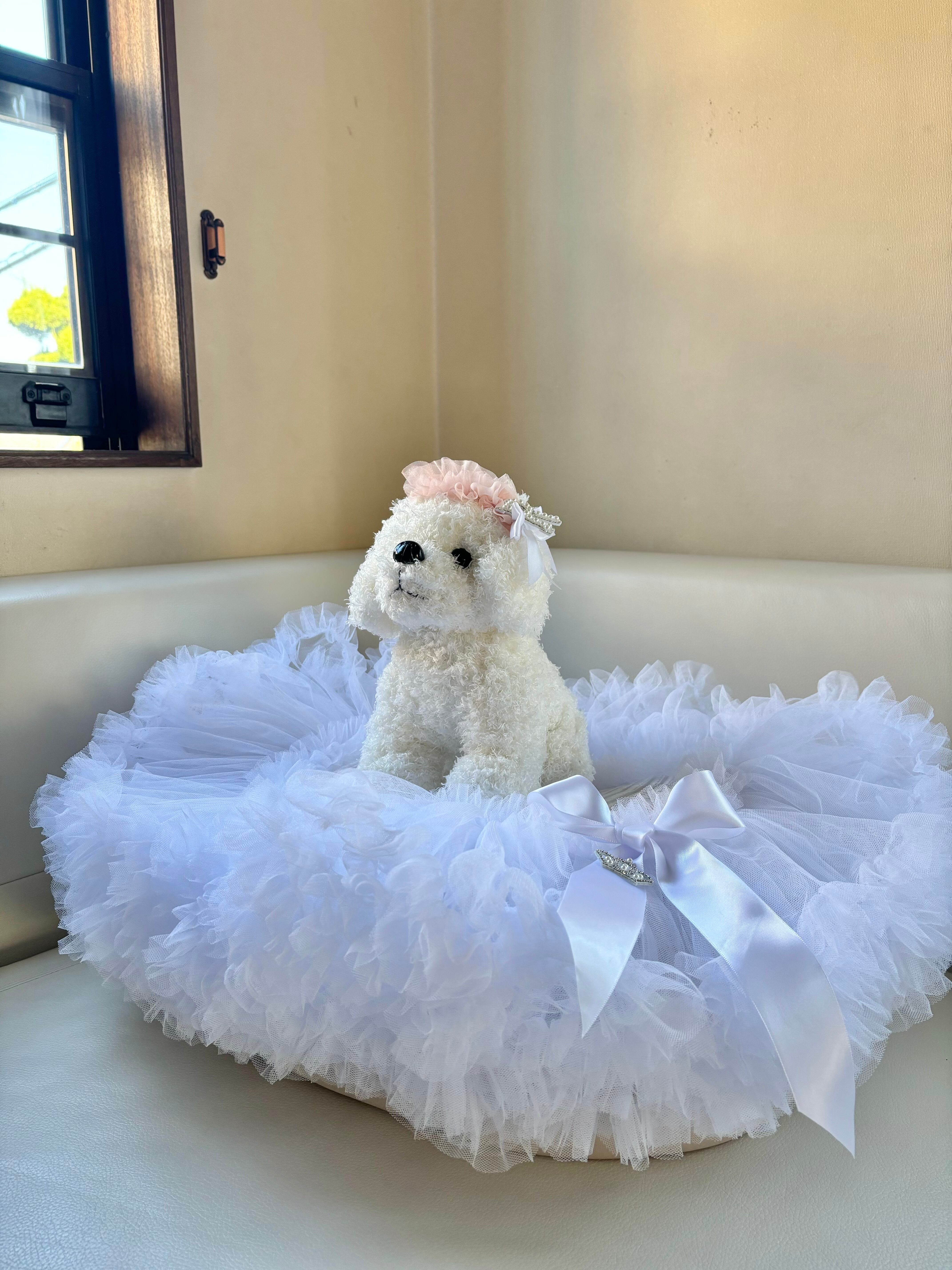 お座り部分には、柔らかなサテン生地を使用し、心地よい時間を提供します。ふわふわのフリルが愛犬を優しく包み込み、特別なひとときを演出するラグジュアリーなマットです。