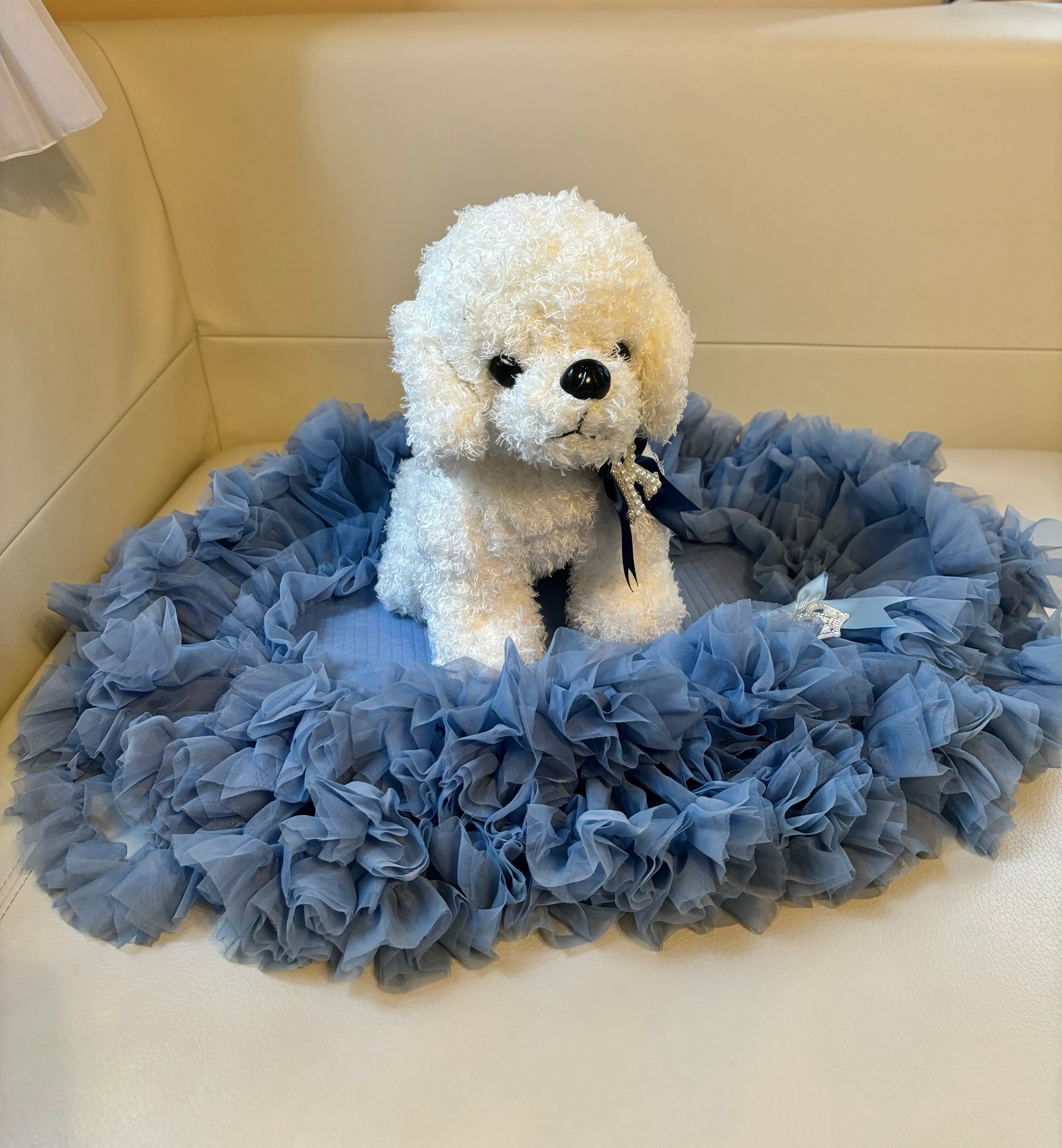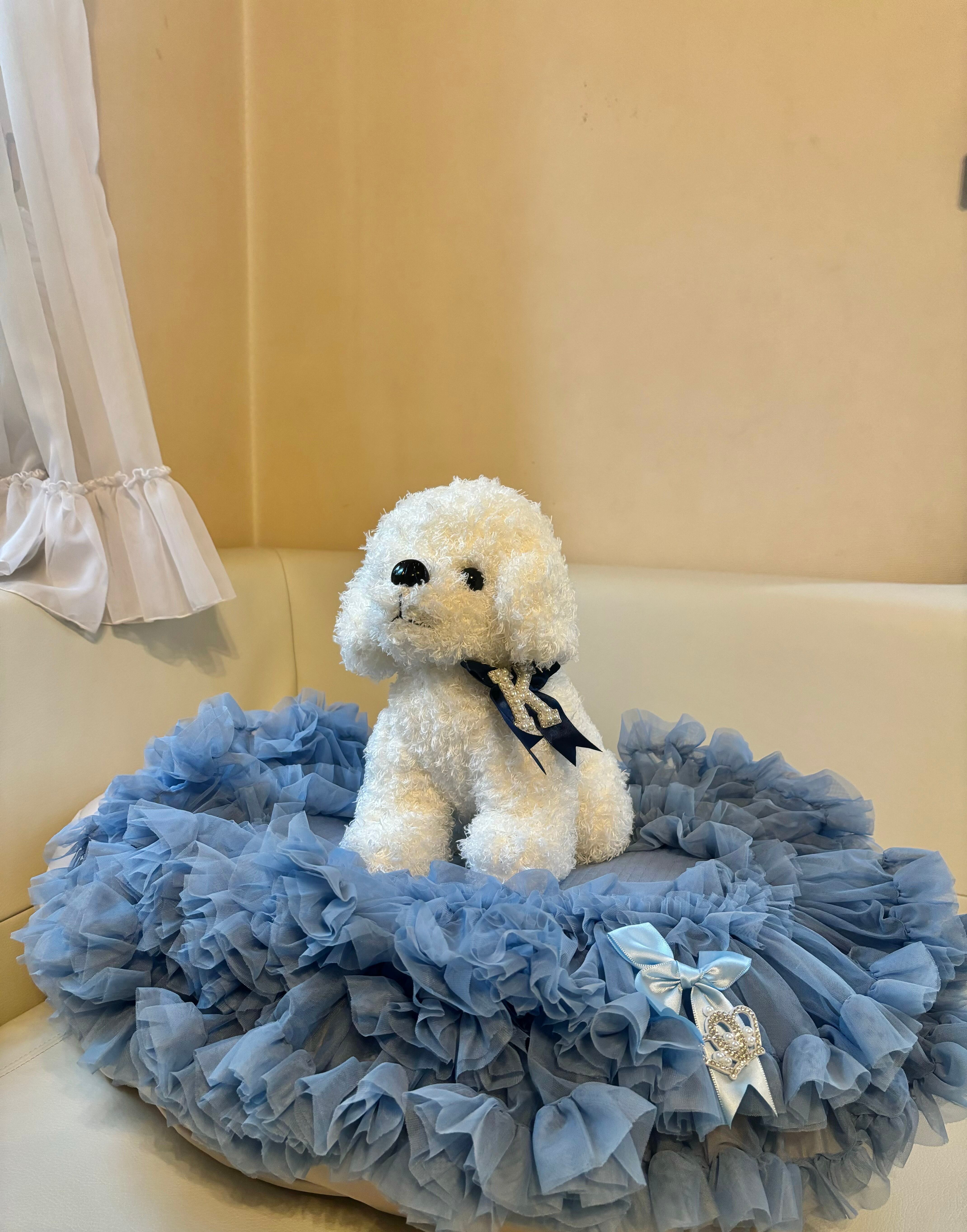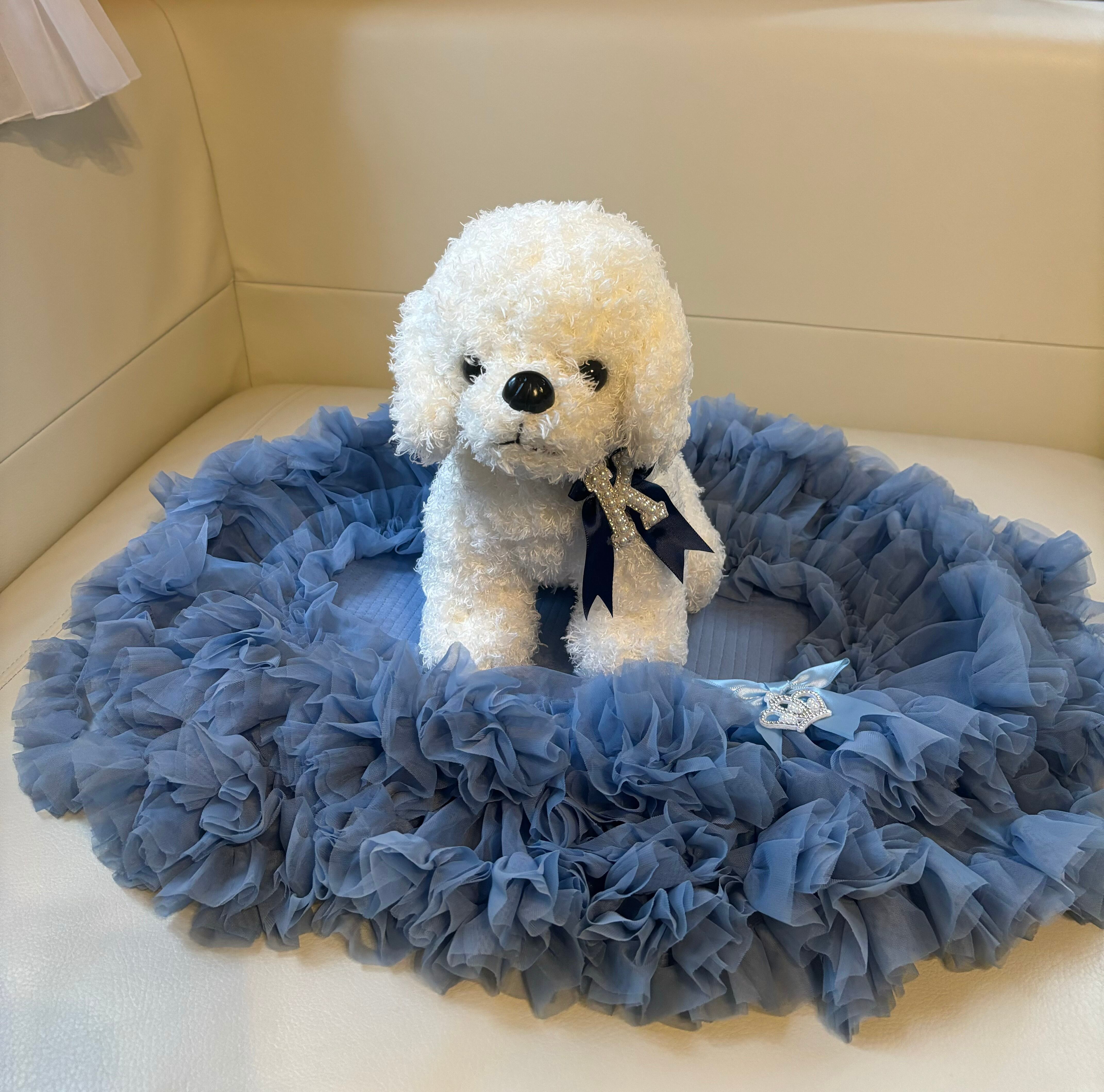 お座り部分には、柔らかい生地を使用しており、持ち運びにも便利な薄手仕様に仕上げています。ふわふわのフリルが愛犬を優しく包み込み、贅沢で特別な時間をお届けします。