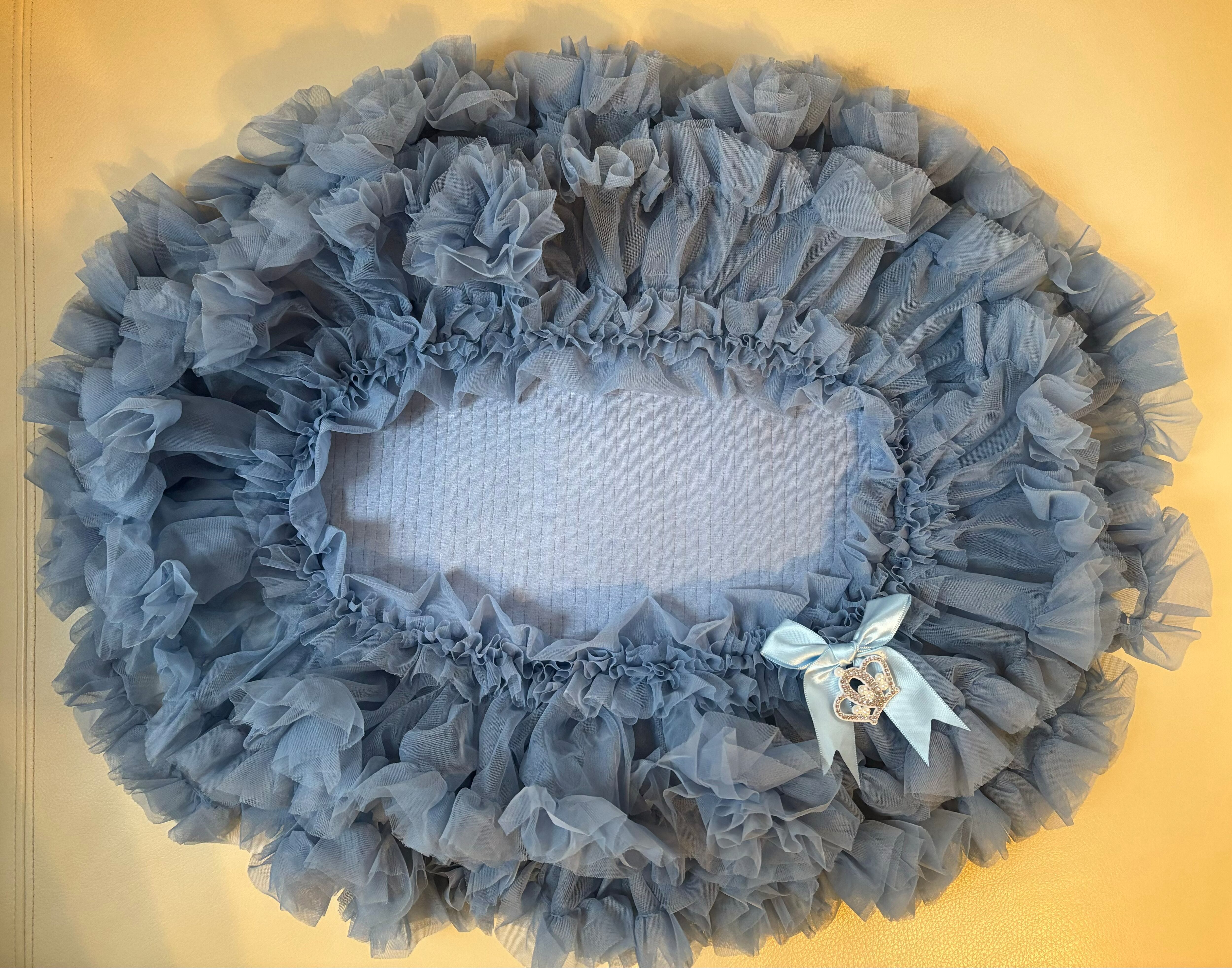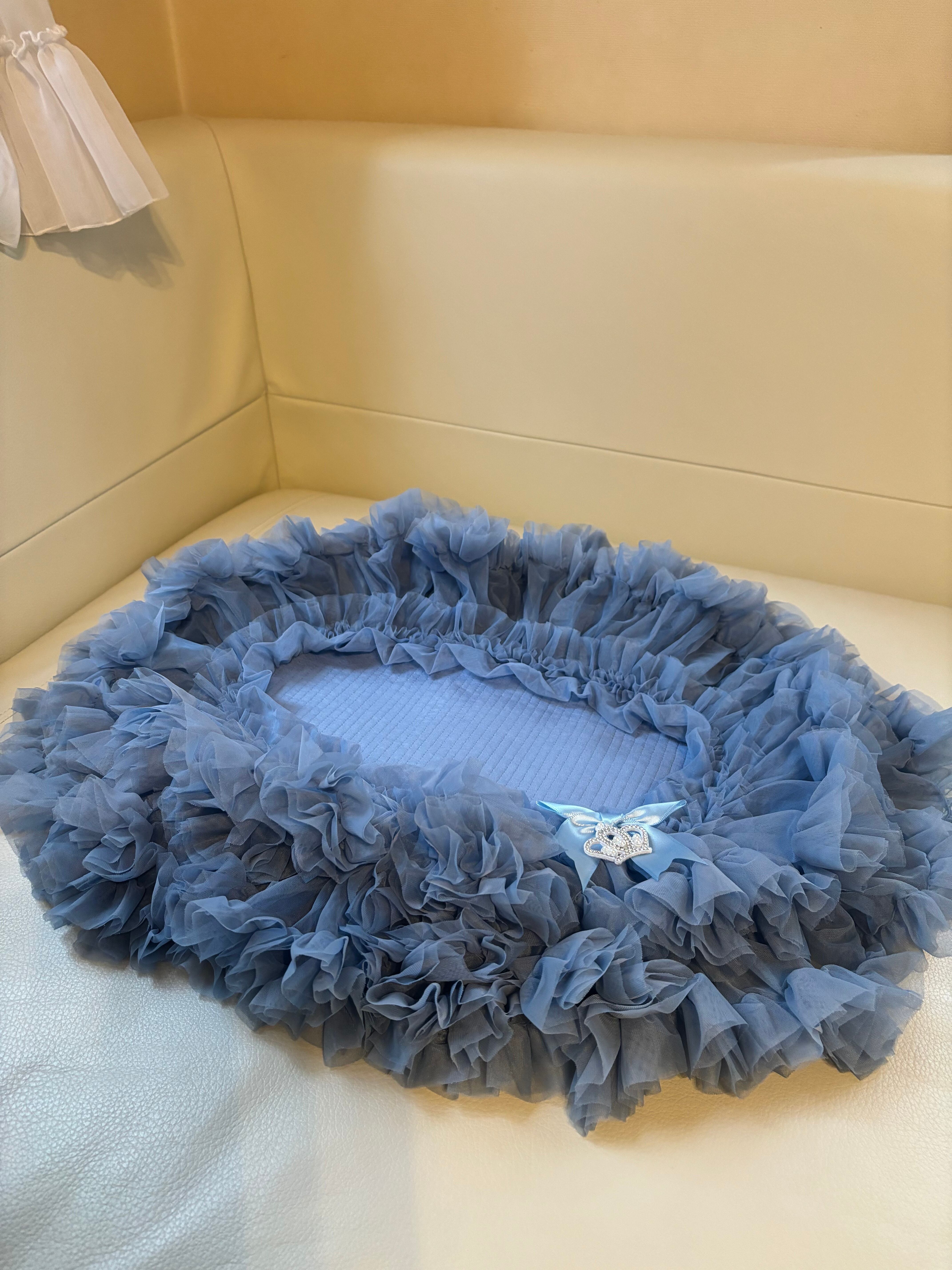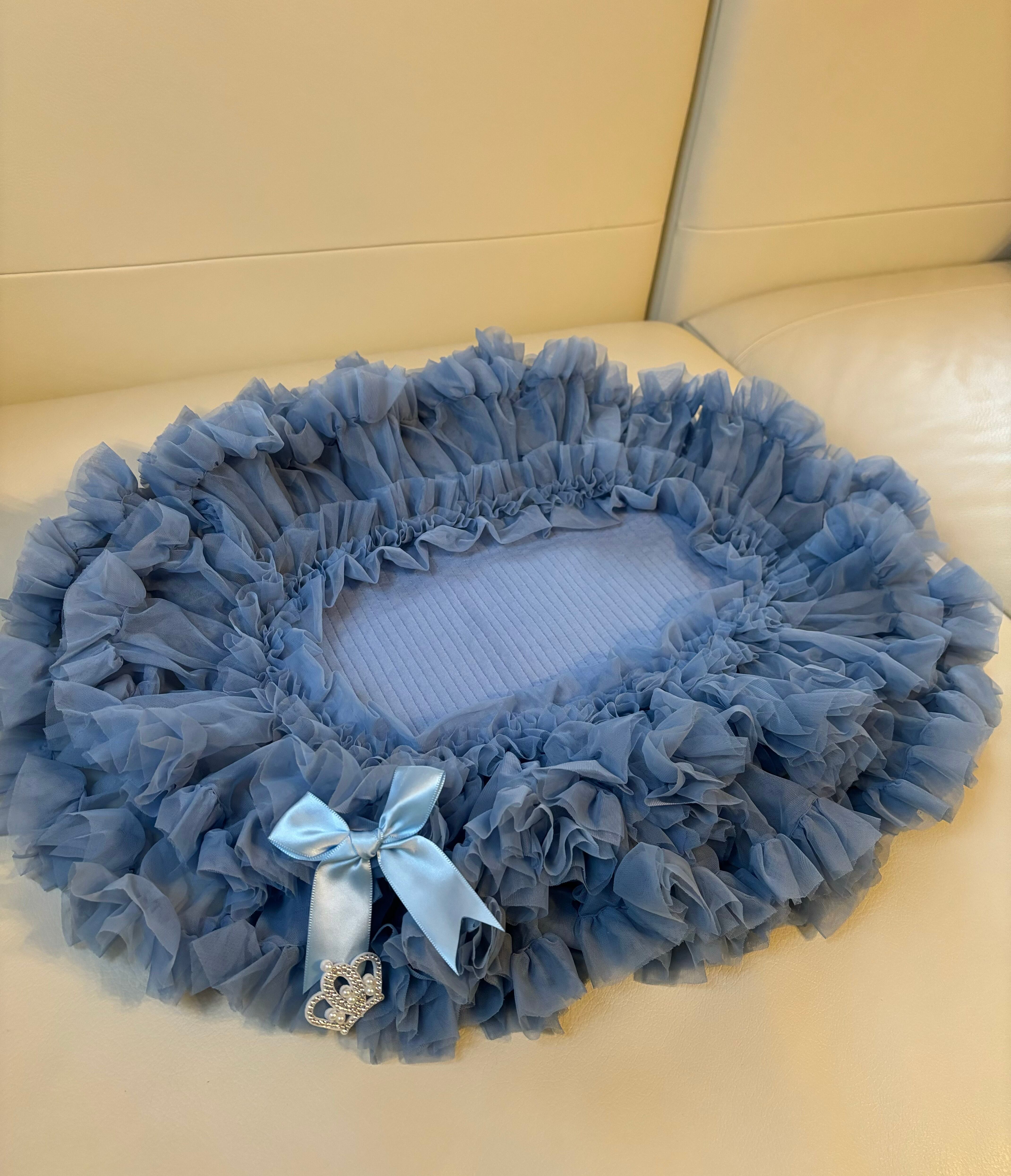 お座り部分には、柔らかい生地を使用しており、持ち運びにも便利な薄手仕様に仕上げています。ふわふわのフリルが愛犬を優しく包み込み、贅沢で特別な時間をお届けします。